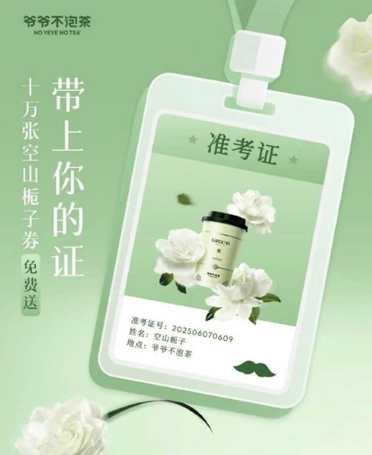 高考功夫,爷爷不沏茶推出“10万杯奶茶送考生”举止,将风趣证件营销升级为全民插足的社交狂欢,修树起一个年青、谅解又有梗的品牌地步。